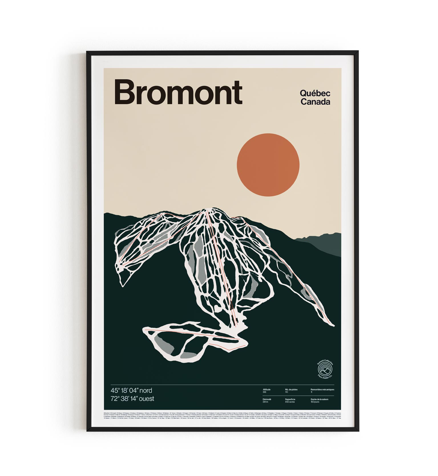 Découvrez l'affiche minimaliste de la carte de la station de ski Bromont montagne d'expérience. Aux côtés de la carte détaillée des pistes, trouvez des statistiques telles que l'altitude, le dénivelé, le nombre de pistes, la superficie, le nombre de remontées mécaniques et la durée moyenne de la saison.